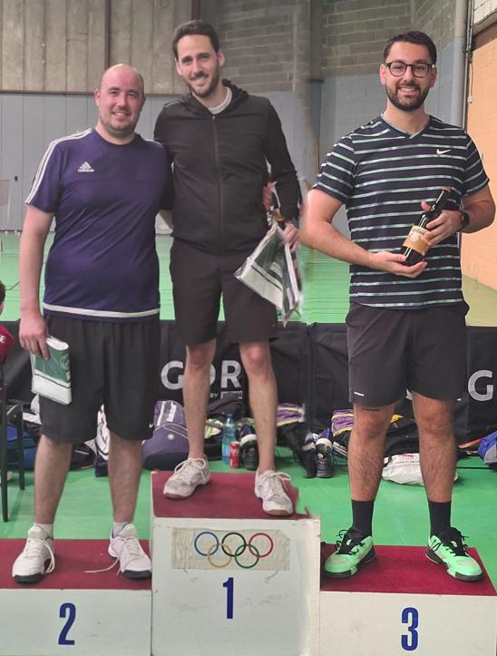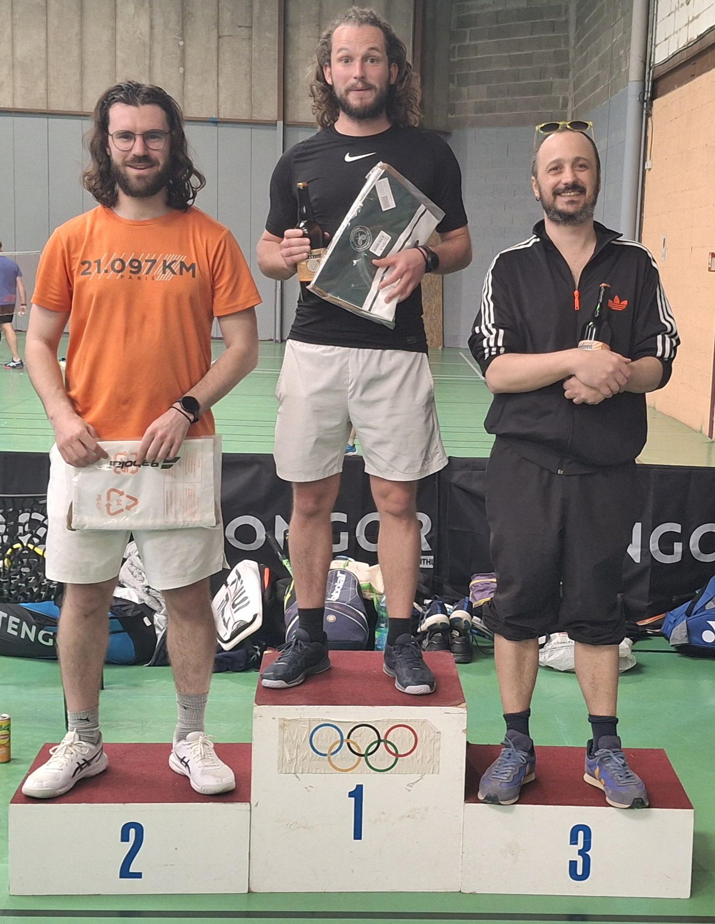 Enfin, dans le tableau de Simple Hommes A, Yves Bret remporte (enfin) son 1er tournoi en A en battant en finale son meilleur ennemi Hervé Tixier ! Les 2 joueurs se sont affrontés à de nombreuses reprises et cette fois, l’écart de 18 points cumulés en faveur d’Yves en badminton et squash lui a permis de s’adjuger la victoire, les 2 joueurs ayant un niveau très proche en ping et tennis. Un 1er titre mérité pour Yves, qui a battu 3 joueurs du Racket’Lyon sur son parcours, Tom Navarre 78/77 ( !), Antoine Durancer 71/70 ( !) et Hervé en finale.<br /> Pour la 3e place, les compères (en 1 seul mot 😊) d’entrainement du Racket’Lyon, Antoine Durancer et Sébastien Guicherd s’affrontent pour la première fois en compétition et c’est Antoine qui s’impose.<br /> A noter l’incroyable 33/31 au badminton entre Vincent Rodriguez et Jean-Baptiste Marx pour un match total à 159 points (84/75 pour Jean-Baptiste) !!<br />